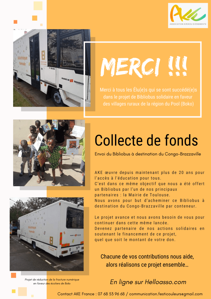 Le projet “Ma Vicky : Bibliobus nomade” est la création d’une bibliothèque nomade afin que les habitants des communes situées dans le milieu rural de la région du Pool et différentes régions du Congo-Brazzaville, puissent avoir accès à des ouvrages littéraires et multimédias. Le bus circulera donc d’un village à un autre pour que chaque habitant ait l’occasion de pouvoir profiter de cette mise à disposition.